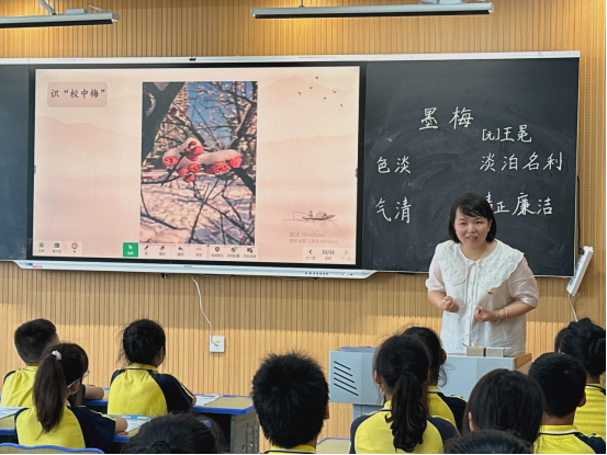 赛场上,各教师或讲述清廉故事、或引入清廉案例、或引荐清廉警句,注重师生互动,内容切合学生年龄特征。曾倩卉老师执教的语文《墨梅》,寻“诗中梅”、析“画中梅”、悟“心中梅”、识“校中梅”四个活动层层深入,引导学生通过了解诗人当时所处的历史背景,想象诗人当时的表情神态及内心情感,从而明白诗人那种不贪图虚荣、不与世俗同流合污如梅花般清正廉洁的品质。