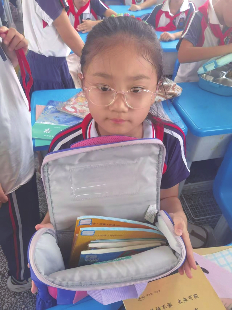 9月11日清晨,益师附小校门口的梧桐叶筛下细碎晨光,四年级学生沐沐晃了晃肩头的蓝色卡通双肩包——这个曾因塞满练习册“坠得脖子酸”的书包,如今只躺着语数英课本、画画本和草稿本,沐沐也有余力手上提着装饭盒的布袋。